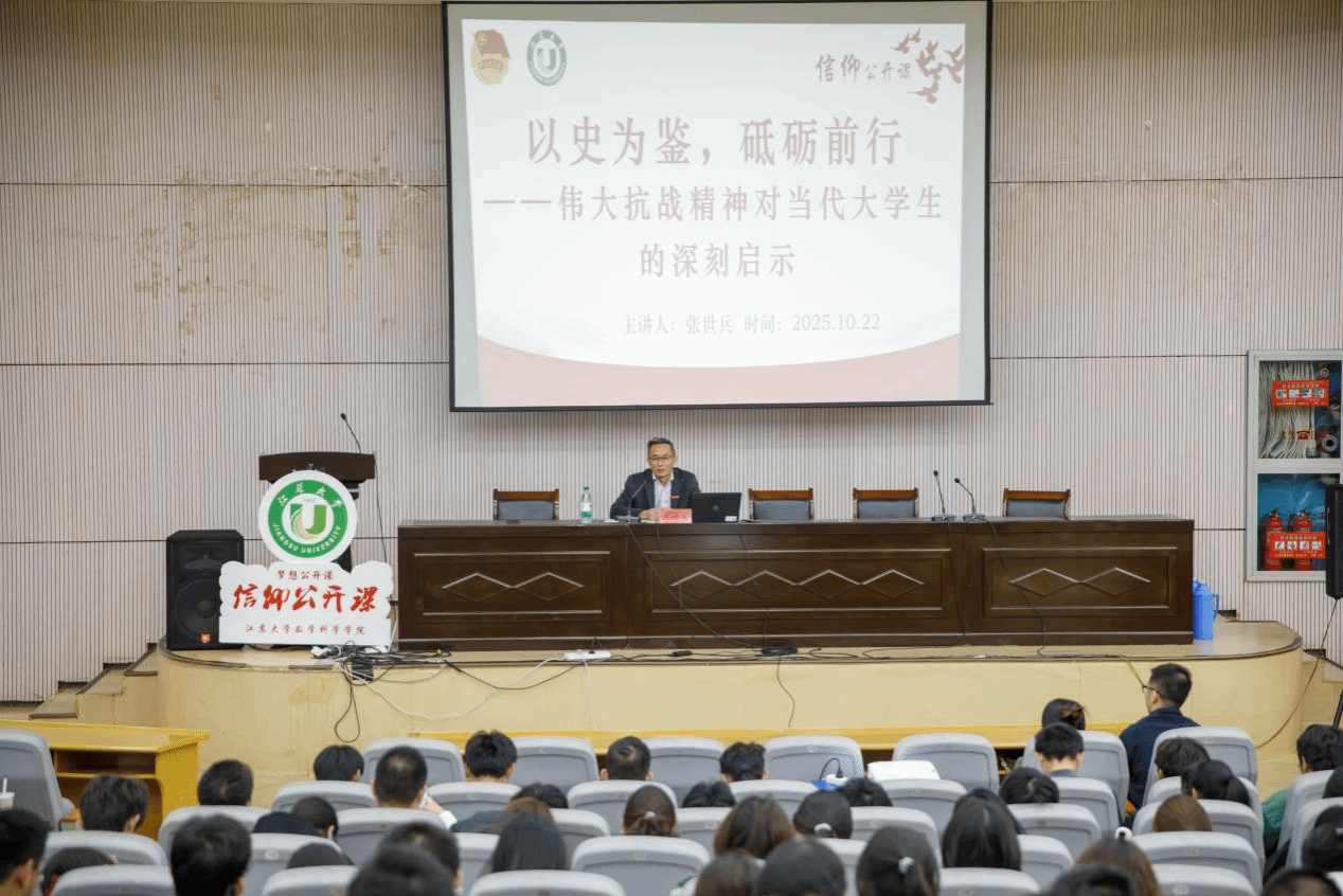 2025年10月22日下午,数学科学学院在研究生报告厅举行2025级新生书记课堂暨信仰公开课。学院党委书记张世兵以“以史为鉴,砥砺前行——伟大抗战精神对当代大学生的深刻启示”为题,为全体新生讲授了一堂思想深刻、振奋人心的信仰教育课。