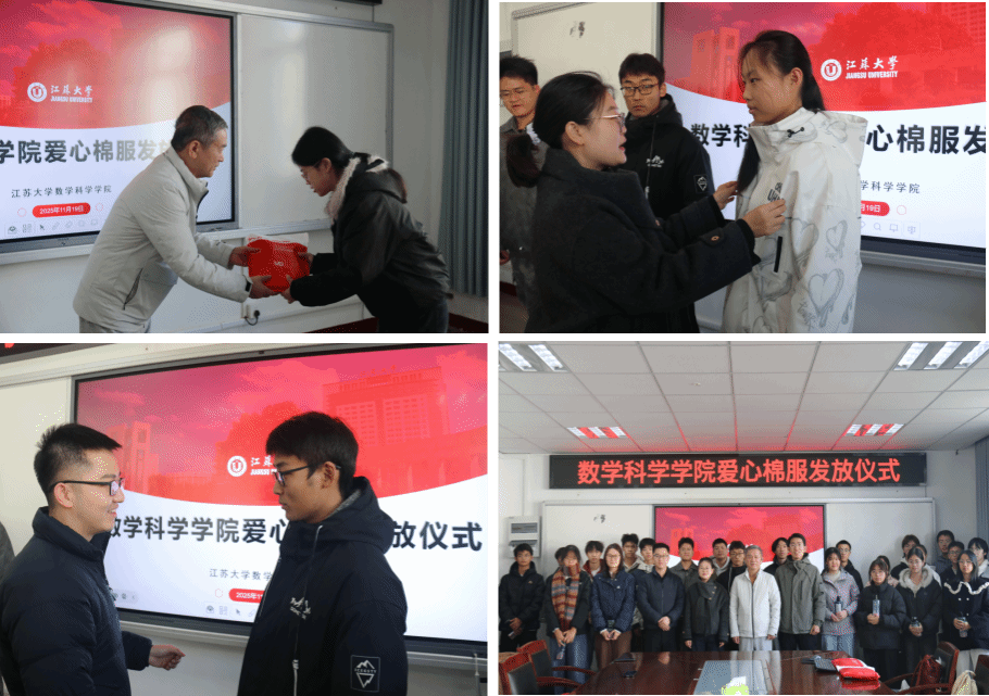 11月19日下午,江苏大学数学科学学院在主楼412会议室举行冬日爱心礼包发放活动。本次活动由学院学生工作办公室组织,关工委老同志卢殿臣应邀出席,辅导员朱江涛、李健、武启慧及二十余名受助学生参加活动。